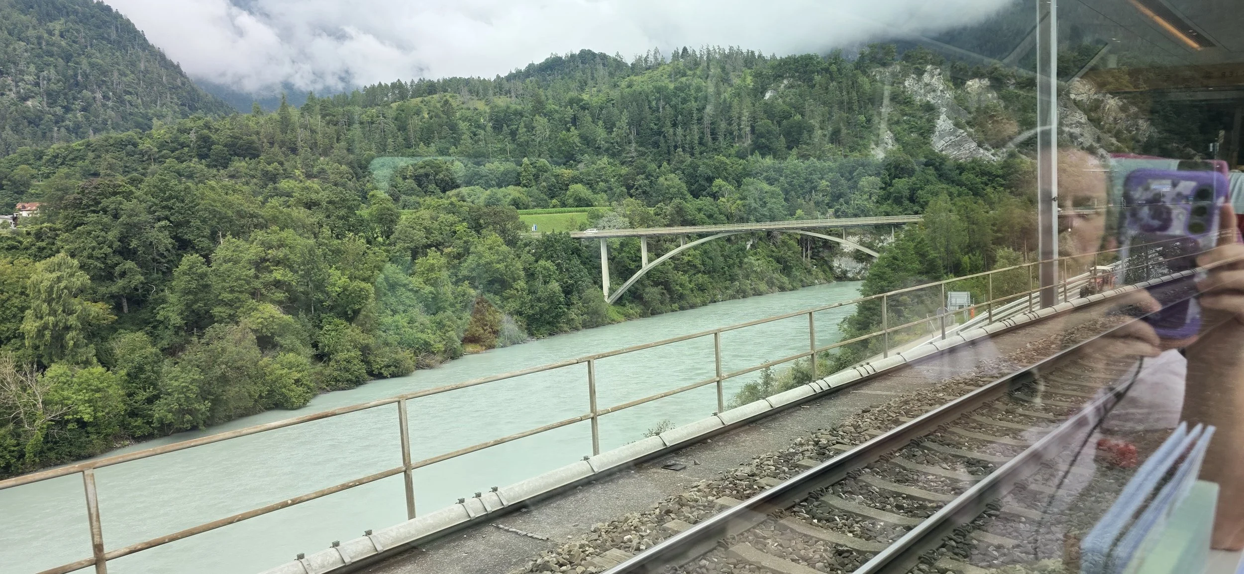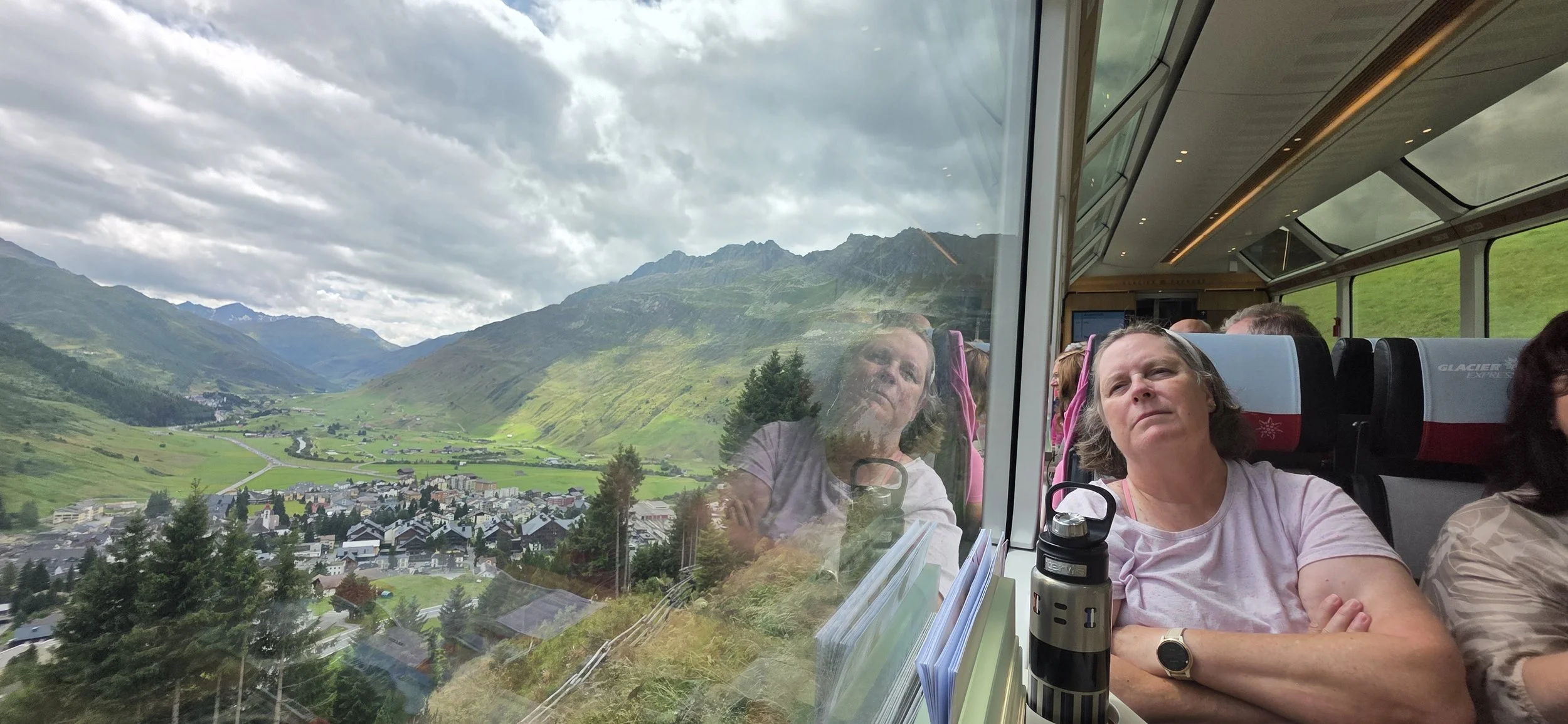 One of the highlights of our trip, maybe THE highlight for Julie, was the Glacier Express. It runs between San Moritz and Zermatt. We boarded the train in San Moritz.